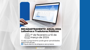 A Junta Comercial do Distrito Federal (JUCIS-DF) informa que o recadastramento anual de Leiloeiros e de Tradutores e Intérpretes Públicos será realizado no período de 1º de fevereiro a 10 de março de 2026, exclusivamente por meio do Portal de Serviços da JUCIS-DF.